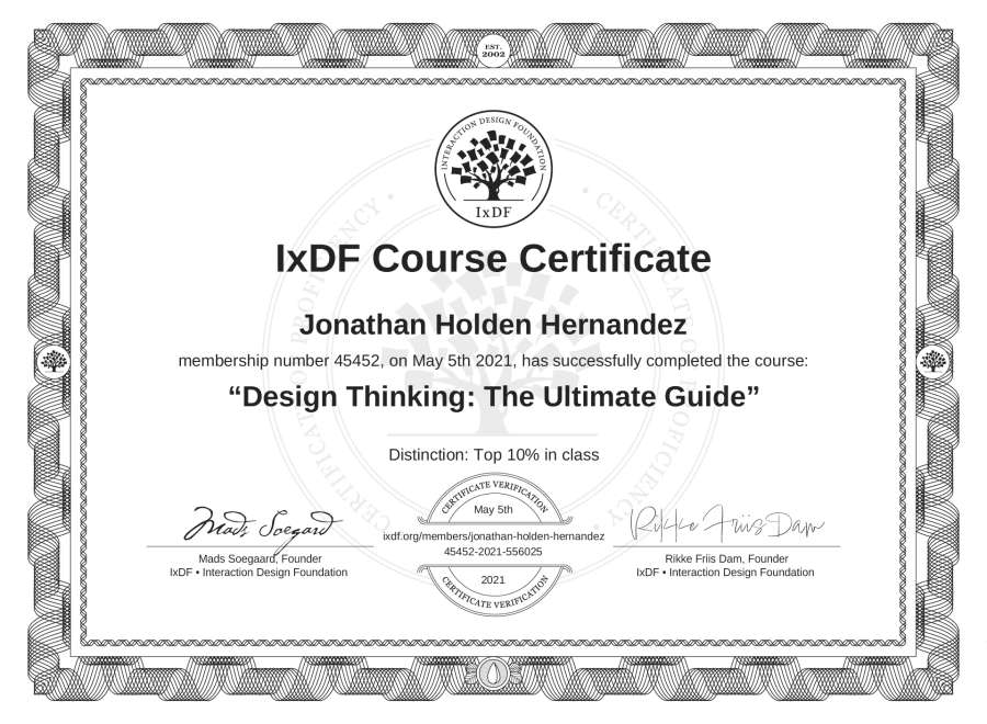 The IxDF Course Certificate above is awarded to Jonathan Holden Hernandez with a Top 10% Distinction in formal recognition of their coursework surpassing the rigorous benchmarks of exceptional performance established by the IxDF Educational Codex.
