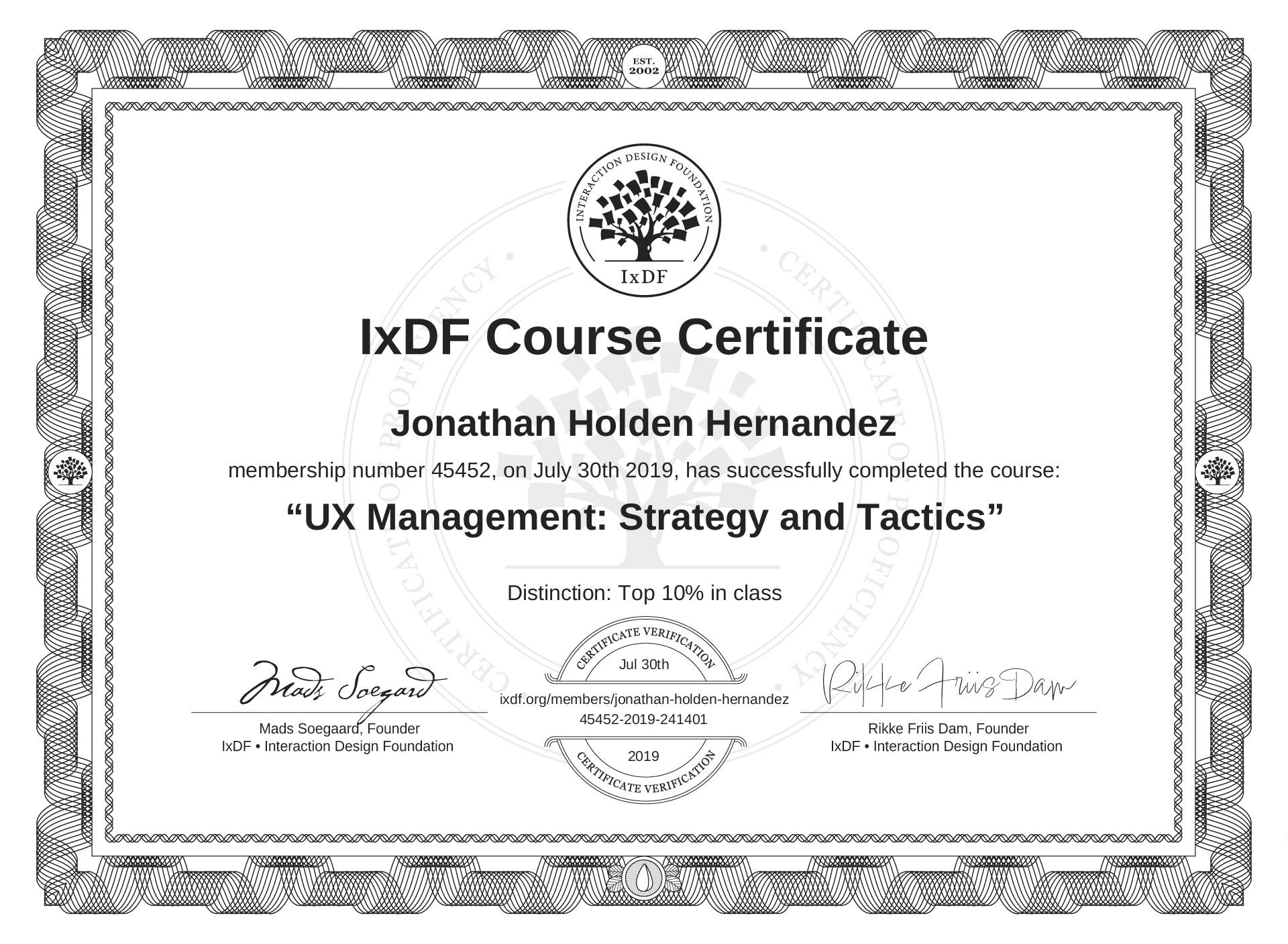 The IxDF Course Certificate above is awarded to Jonathan Holden Hernandez with a Top 10% Distinction in formal recognition of their coursework surpassing the rigorous benchmarks of exceptional performance established by the IxDF Educational Codex.