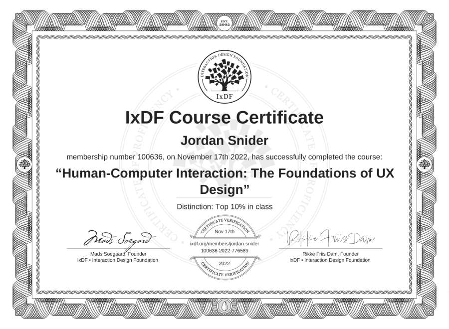 Jordan Snider's IxDF Course Certificate: Human-Computer Interaction: The Foundations of UX Design