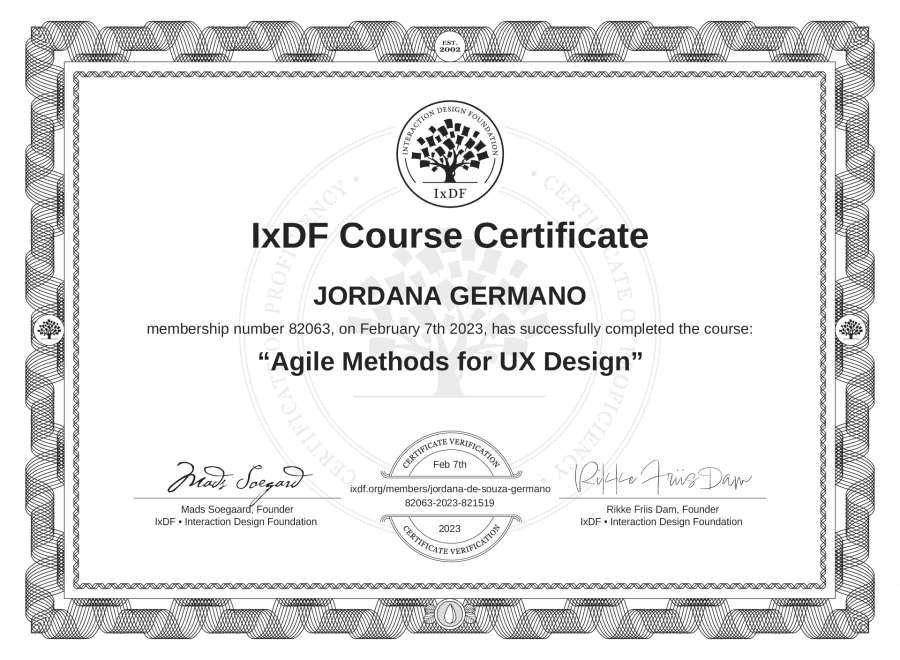 The IxDF Course Certificate above is awarded to JORDANA GERMANO in formal recognition of their coursework surpassing the rigorous benchmarks of exceptional performance established by the IxDF Educational Codex.
