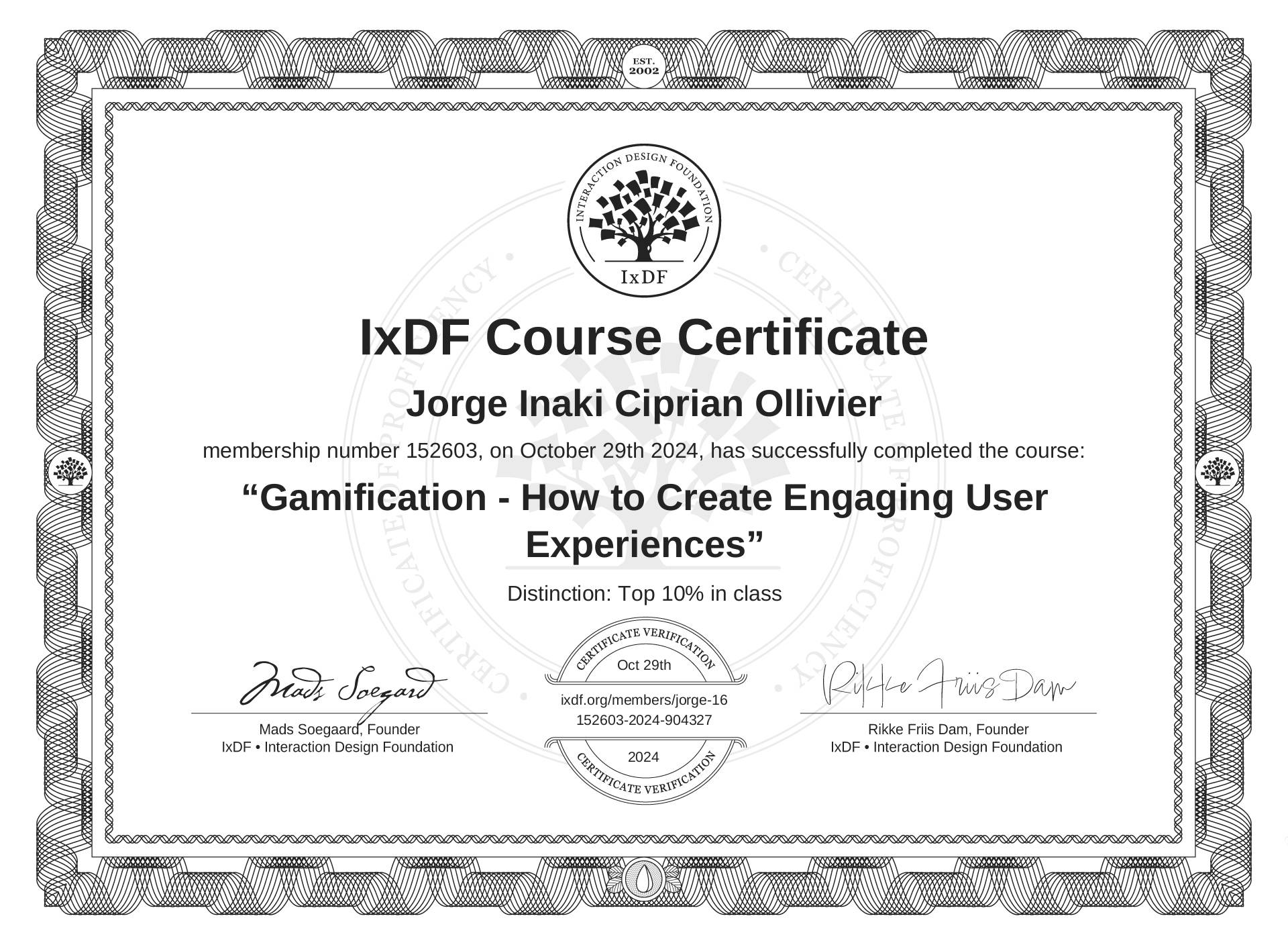 Jorge Iñaki Ciprian Ollivier's IxDF Course Certificate: Gamification - How to Create Engaging User Experiences