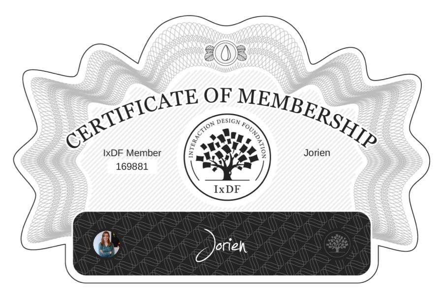 The Membership Certificate below verifies that Jorien is a member of Interaction Design Foundation.