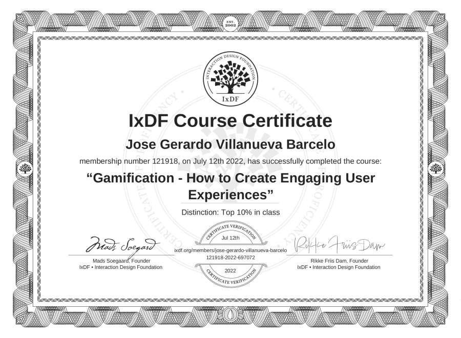 Jose Gerardo Villanueva Barcelo's IxDF Course Certificate: Gamification - How to Create Engaging User Experiences