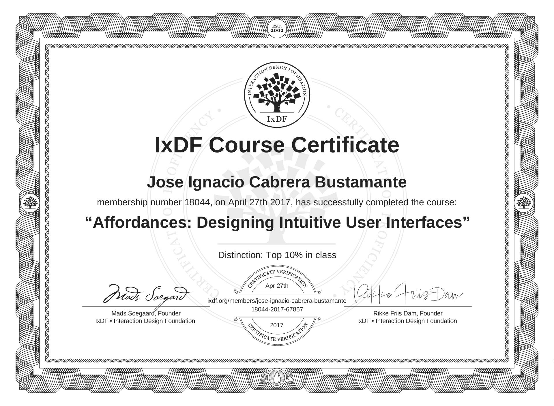 The IxDF Course Certificate above is awarded to Jose Ignacio Cabrera Bustamante with a Top 10% Distinction in formal recognition of their coursework surpassing the rigorous benchmarks of exceptional performance established by the IxDF Educational Codex.