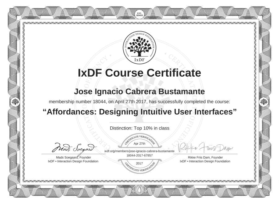 Jose Ignacio Cabrera Bustamante's IxDF Course Certificate: Affordances: Designing Intuitive User Interfaces