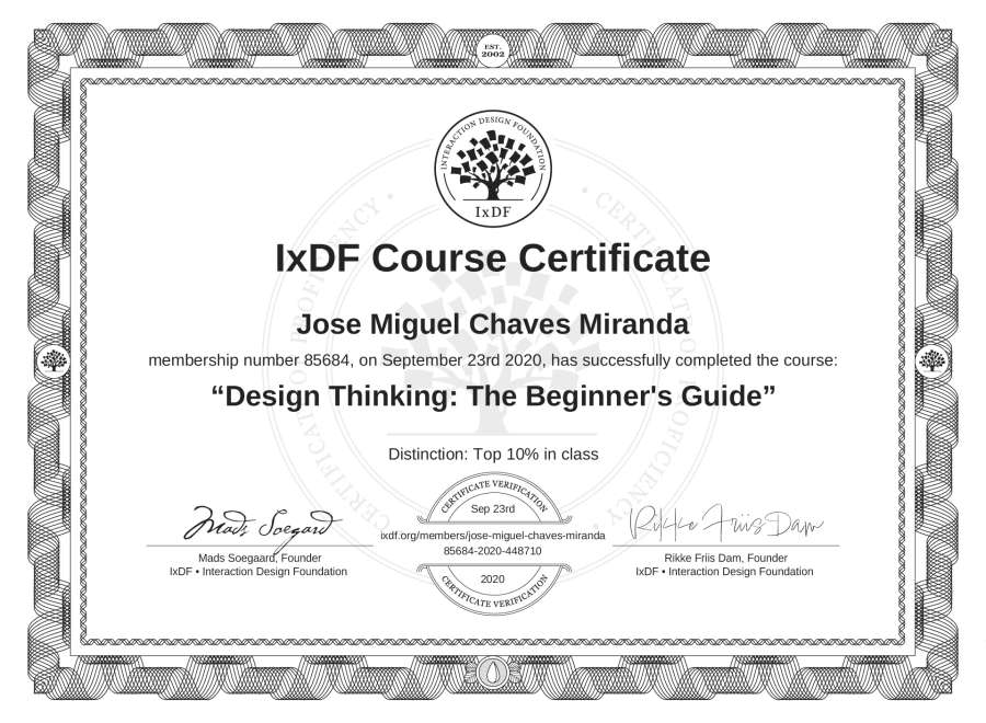The IxDF Course Certificate above is awarded to Jose Miguel Chaves Miranda with a Top 10% Distinction in formal recognition of their coursework surpassing the rigorous benchmarks of exceptional performance established by the IxDF Educational Codex.