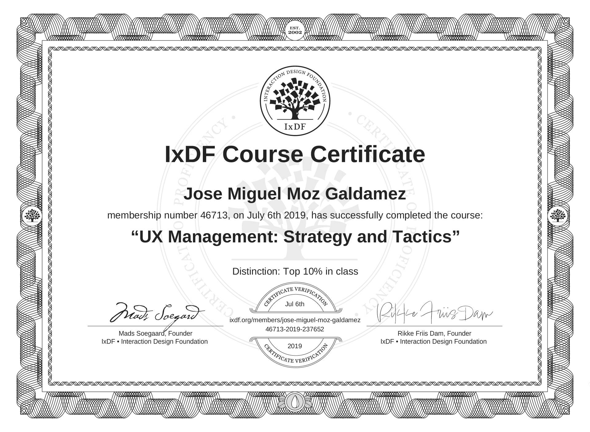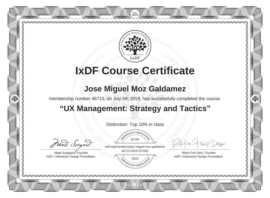 José Miguel Moz Galdámez's IxDF Course Certificate: UX Management: Strategy and Tactics