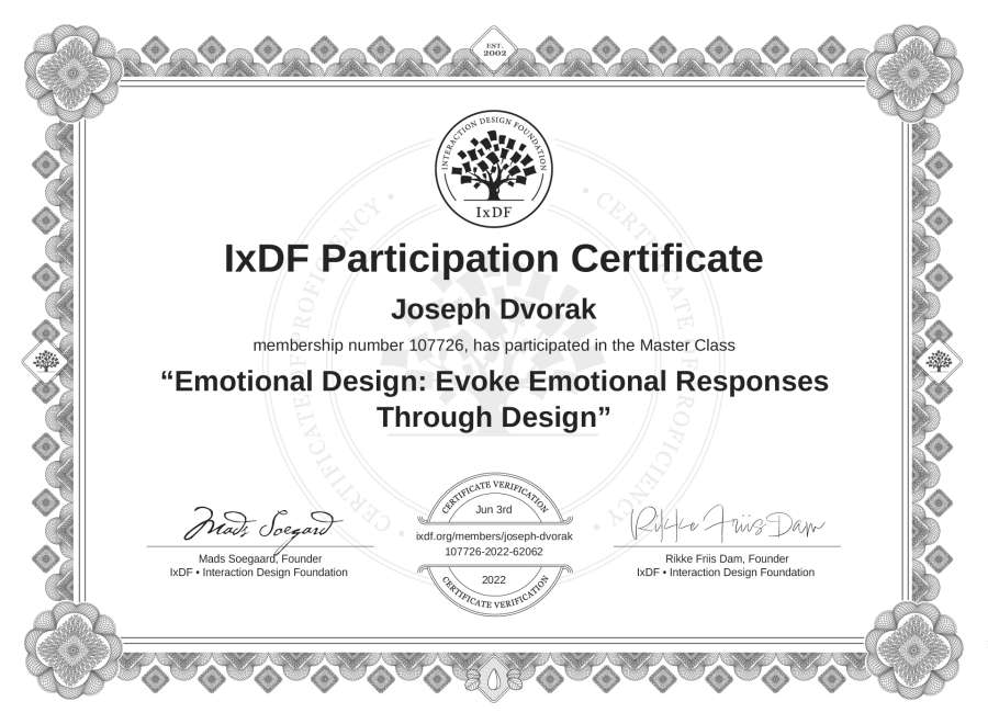 Joseph Dvorak's IxDF Masterclass Certificate: Emotional Design: Evoke Emotional Responses Through Design