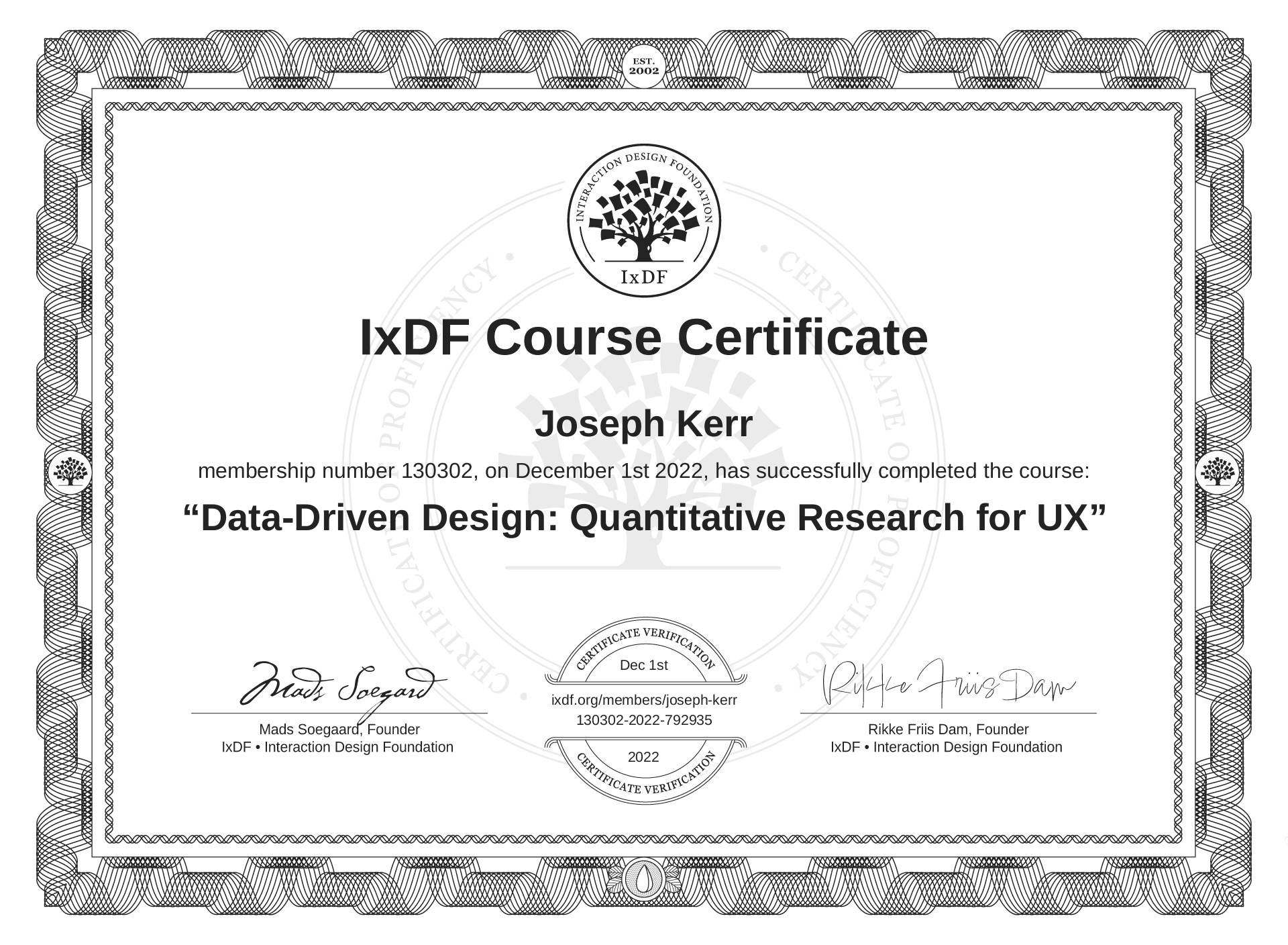 Joseph Kerr's IxDF Course Certificate: Data-Driven Design: Quantitative Research for UX