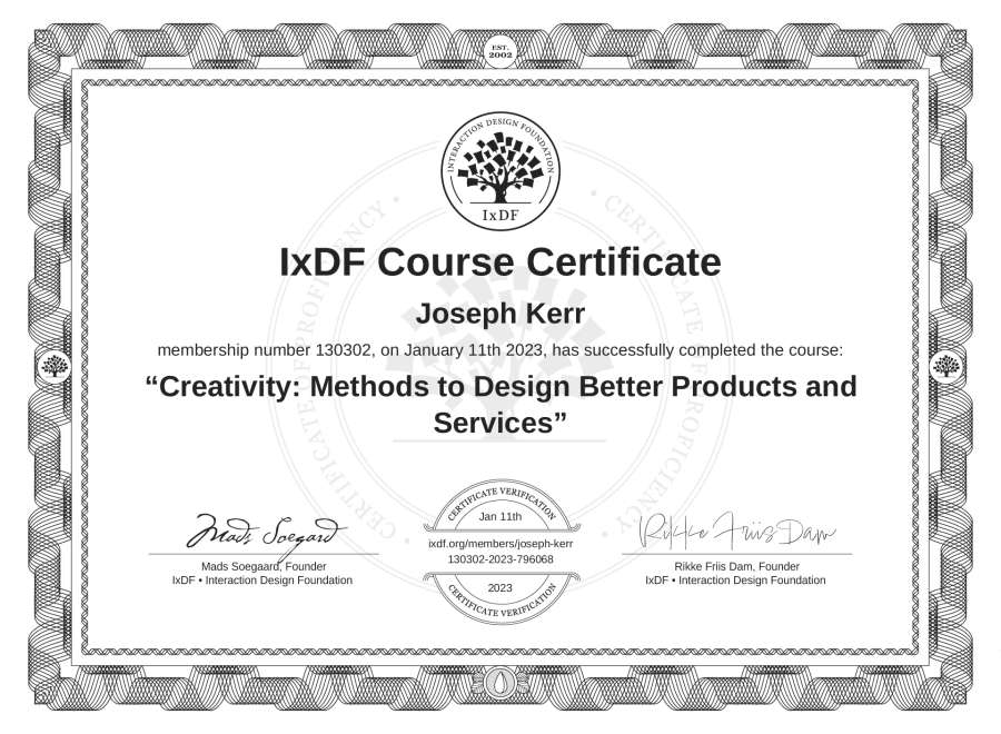 Joseph Kerr's IxDF Course Certificate: Creativity: Methods to Design Better Products and Services