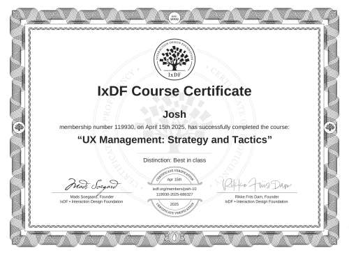 IxDF Course Certificates are awarded to Josh in formal recognition of their coursework surpassing the rigorous benchmarks of exceptional performance established by the IxDF Educational Codex.