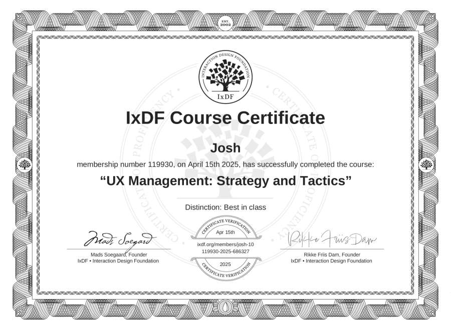 The IxDF Course Certificate above is awarded to Josh with a Best in Class Distinction in formal recognition of their coursework surpassing the rigorous benchmarks of exceptional performance established by the IxDF Educational Codex.