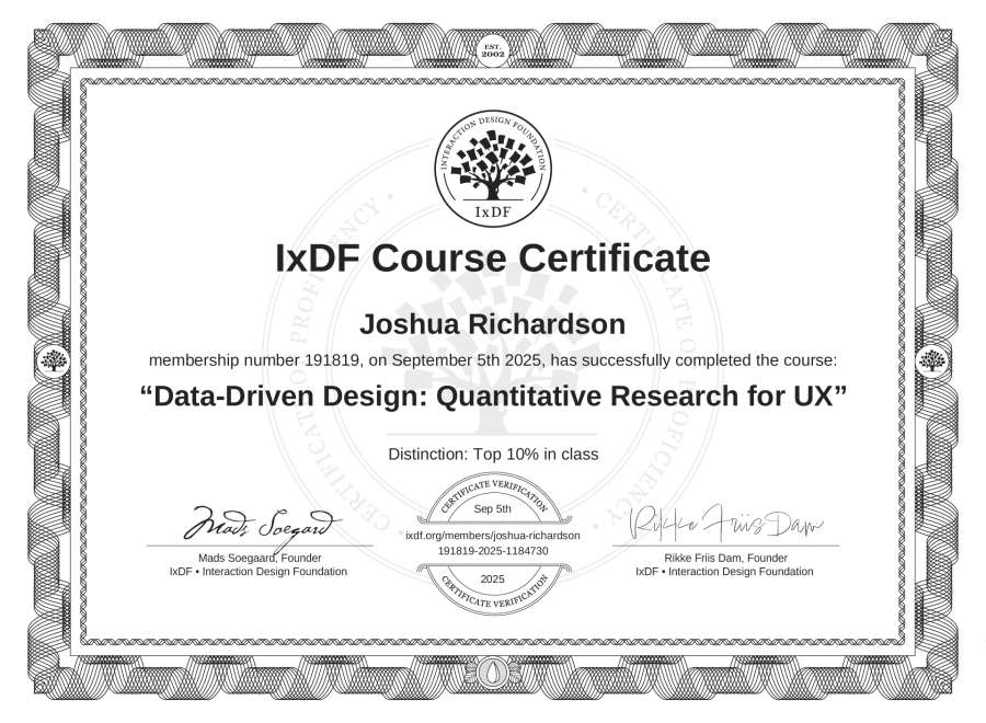 Joshua Richardson's IxDF Course Certificate: Data-Driven Design: Quantitative Research for UX
