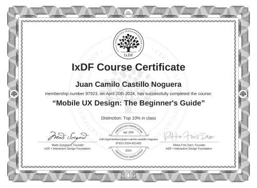 IxDF Course Certificates are awarded to Juan Camilo Castillo Noguera in formal recognition of their coursework surpassing the rigorous benchmarks of exceptional performance established by the IxDF Educational Codex.
