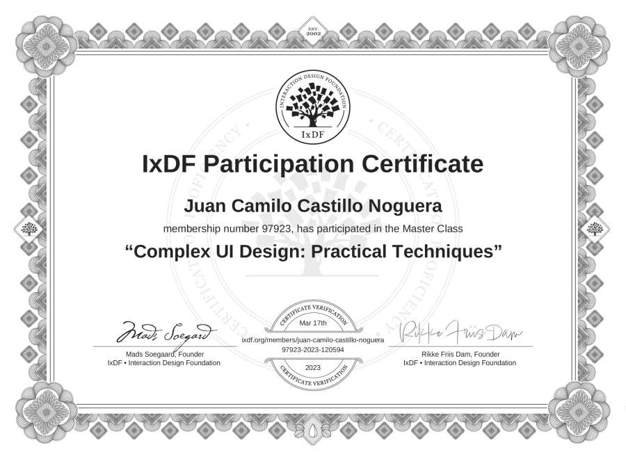 Juan Camilo Castillo Noguera's IxDF Masterclass Certificate: Complex UI Design: Practical Techniques