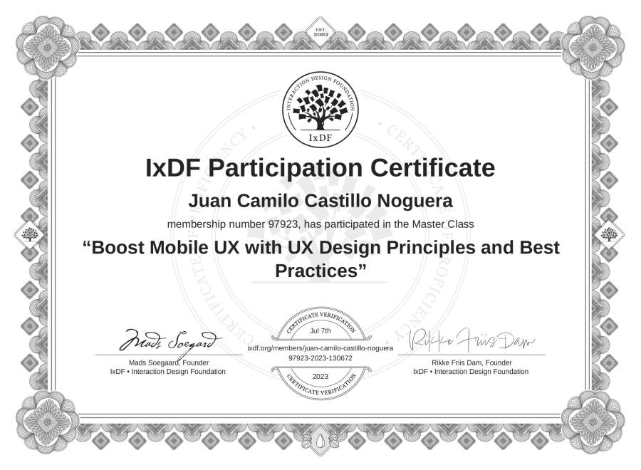 Juan Camilo Castillo Noguera's IxDF Masterclass Certificate: Boost Mobile UX with UX Design Principles and Best Practices