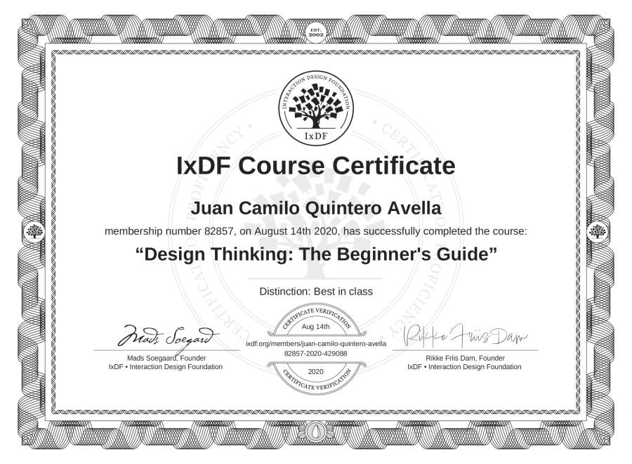 The IxDF Course Certificate above is awarded to Juan Camilo Quintero Avella with a Best in Class Distinction in formal recognition of their coursework surpassing the rigorous benchmarks of exceptional performance established by the IxDF Educational Codex.
