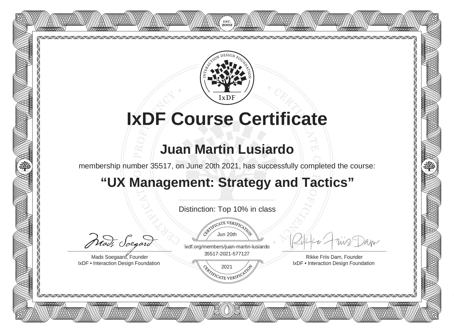Juan Martin Lusiardo's IxDF Course Certificate: UX Management: Strategy and Tactics