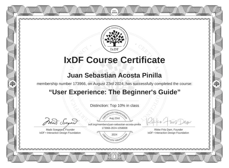 Juan Sebastian Acosta Pinilla's IxDF Course Certificate: User Experience: The Beginner's Guide