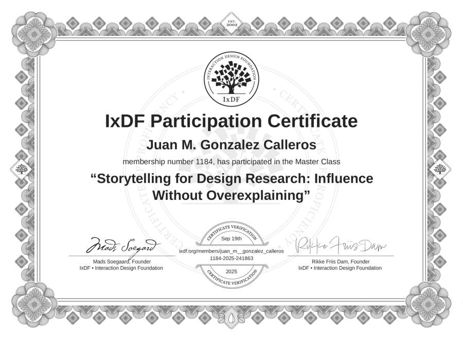 Juan M. Gonzalez Calleros's IxDF Masterclass Certificate: Storytelling for Design Research: Influence Without Overexplaining