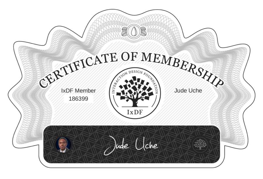 The Membership Certificate below verifies that Jude Uche is a member of Interaction Design Foundation.