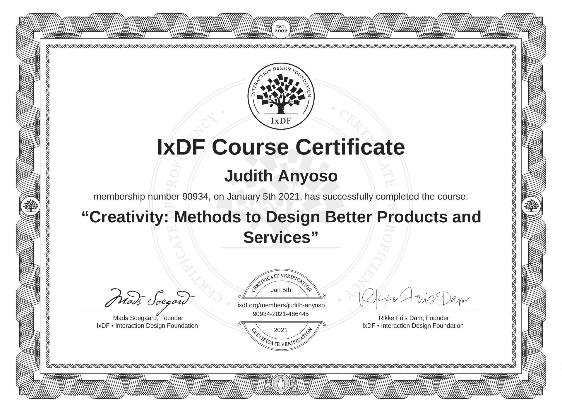 Judith Anyoso's IxDF Course Certificate: Creativity: Methods to Design Better Products and Services