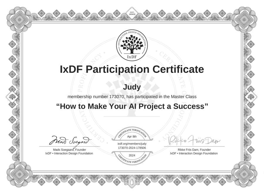 Judy's IxDF Masterclass Certificate: How to Make Your AI Project a Success