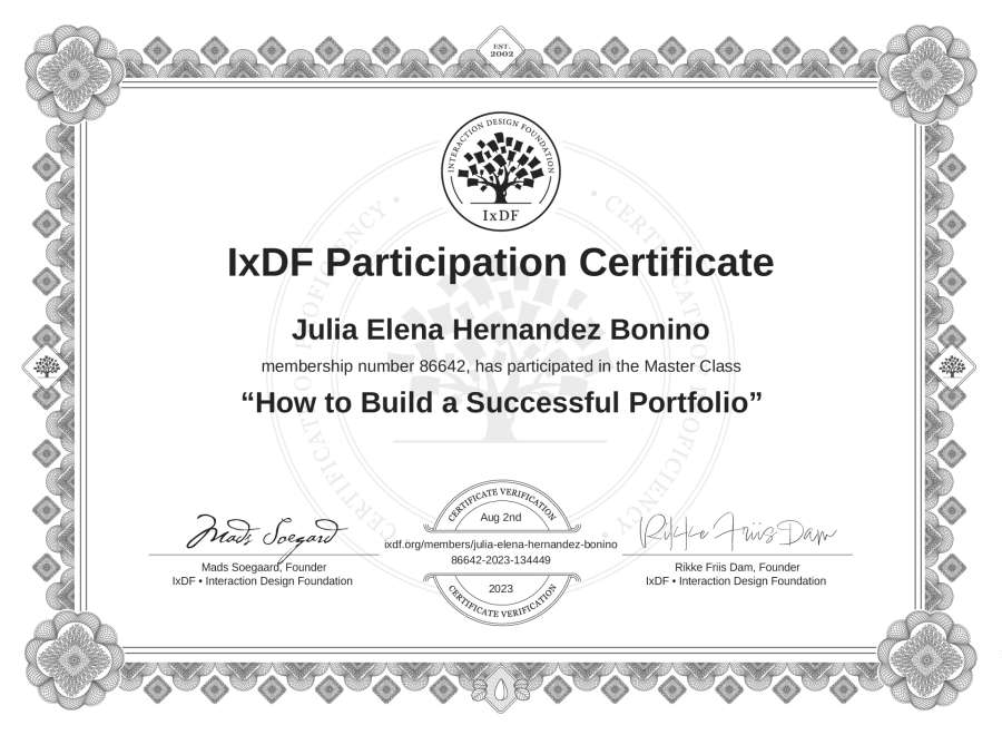 Julia Elena Hernández Bonino's IxDF Masterclass Certificate: How to Build a Successful Portfolio