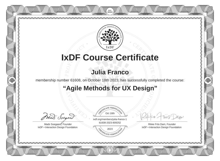 Júlia Franco's IxDF Course Certificate: Agile Methods for UX Design