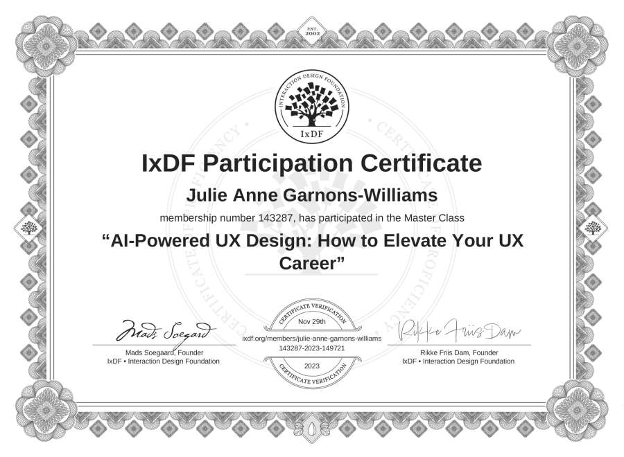 Julie Anne Garnons-Williams's IxDF Masterclass Certificate: AI-Powered UX Design: How to Elevate Your UX Career