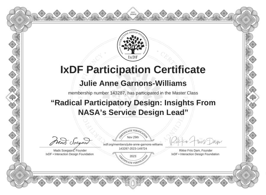 Julie Anne Garnons-Williams's IxDF Masterclass Certificate: Radical Participatory Design: Insights From NASA’s Service Design Lead