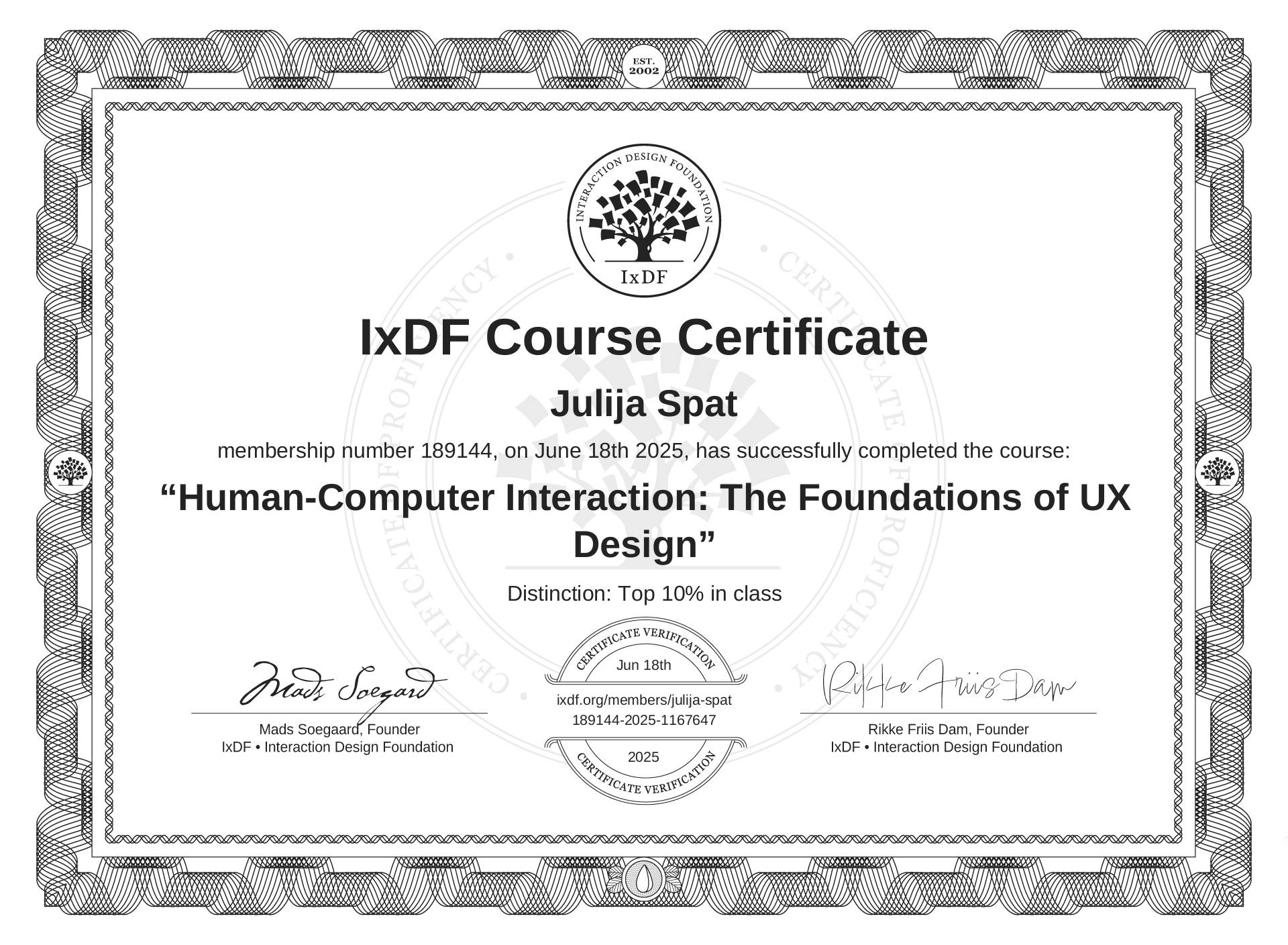 The IxDF Course Certificate above is awarded to Julija Spät with a Top 10% Distinction in formal recognition of their coursework surpassing the rigorous benchmarks of exceptional performance established by the IxDF Educational Codex.