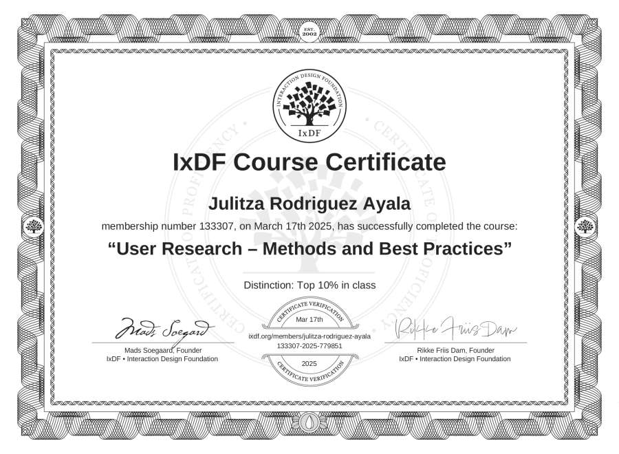 Julitza Rodriguez Ayala's IxDF Course Certificate: User Research – Methods and Best Practices