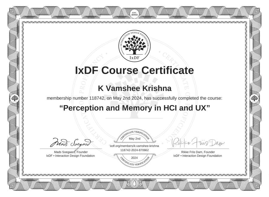 K Vamshee Krishna's IxDF Course Certificate: Perception and Memory in HCI and UX