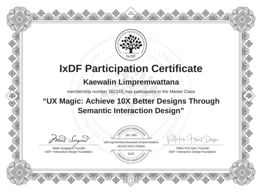 Kaewalin Limpremwattana's IxDF Masterclass Certificate: UX Magic: Achieve 10X Better Designs Through Semantic Interaction Design