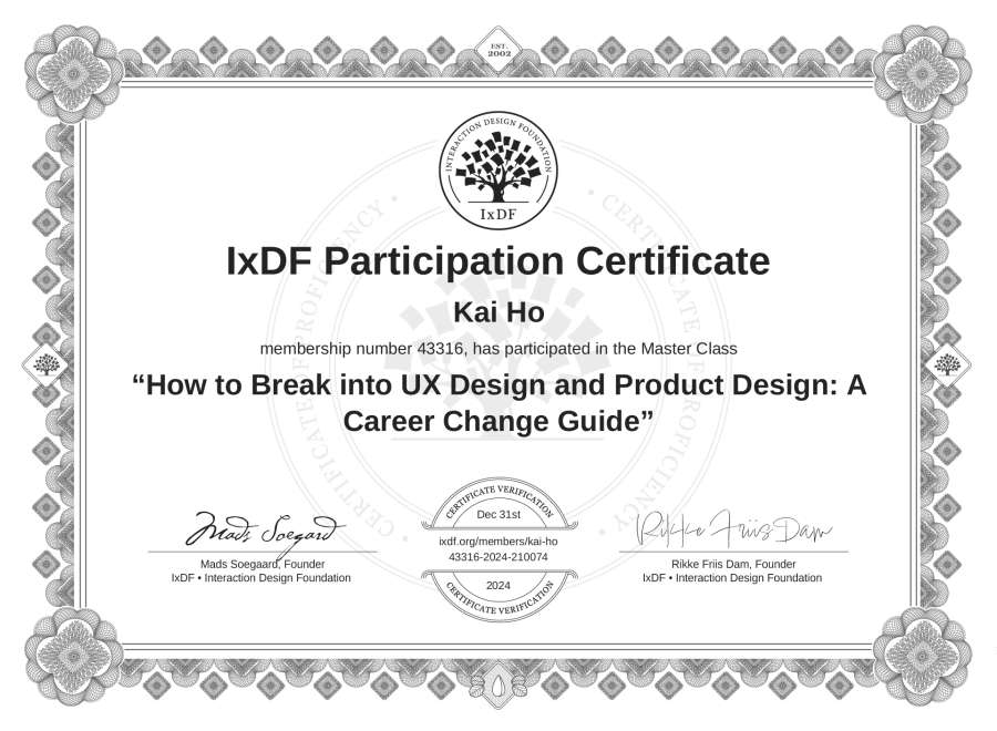 Kai Ho's IxDF Masterclass Certificate: How to Break into UX Design and Product Design: A Career Change Guide