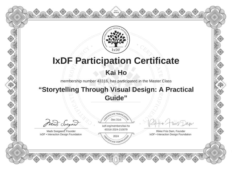 Kai Ho's IxDF Masterclass Certificate: Storytelling Through Visual Design: A Practical Guide