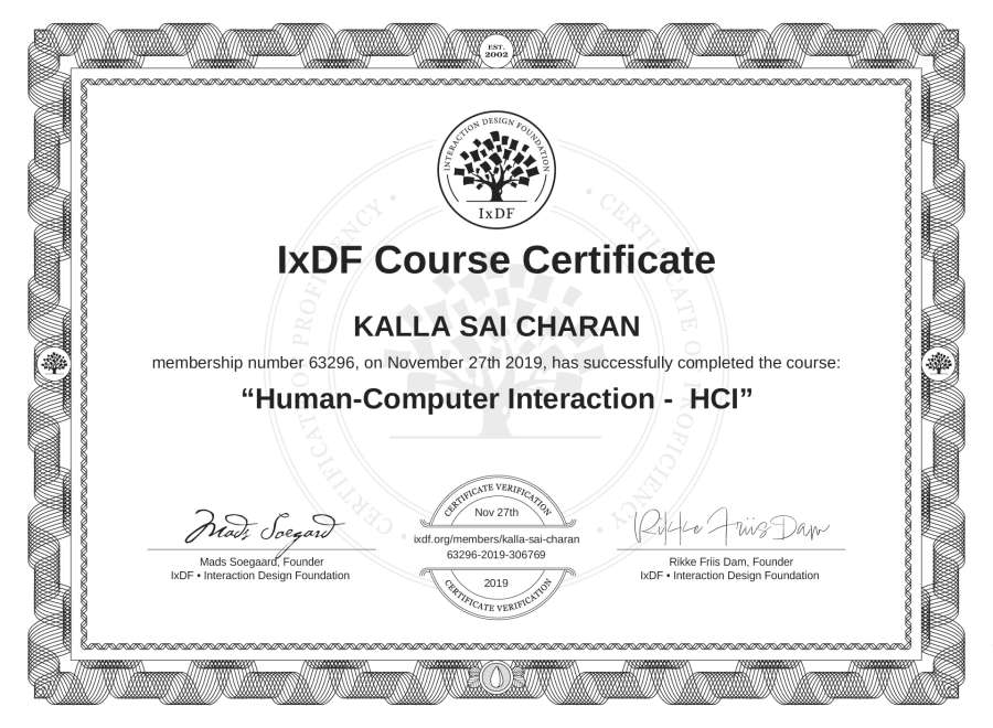 KALLA SAI CHARAN's IxDF Course Certificate: Human-Computer Interaction - HCI