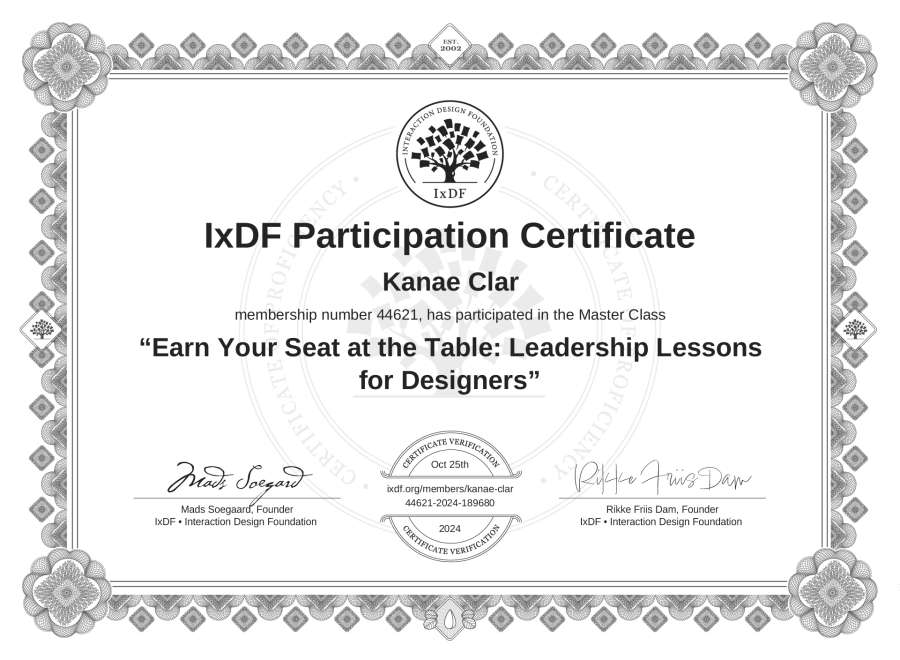 Kanae Clar's IxDF Masterclass Certificate: Earn Your Seat at the Table: Leadership Lessons for Designers
