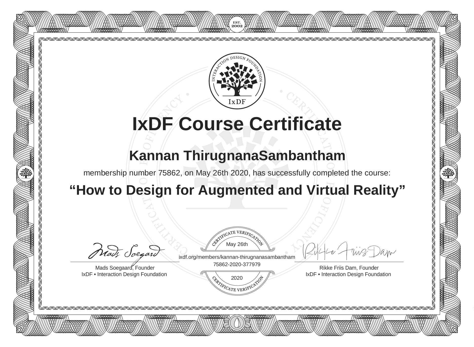 Kannan ThirugnanaSambantham's IxDF Course Certificate: How to Design for Augmented and Virtual Reality