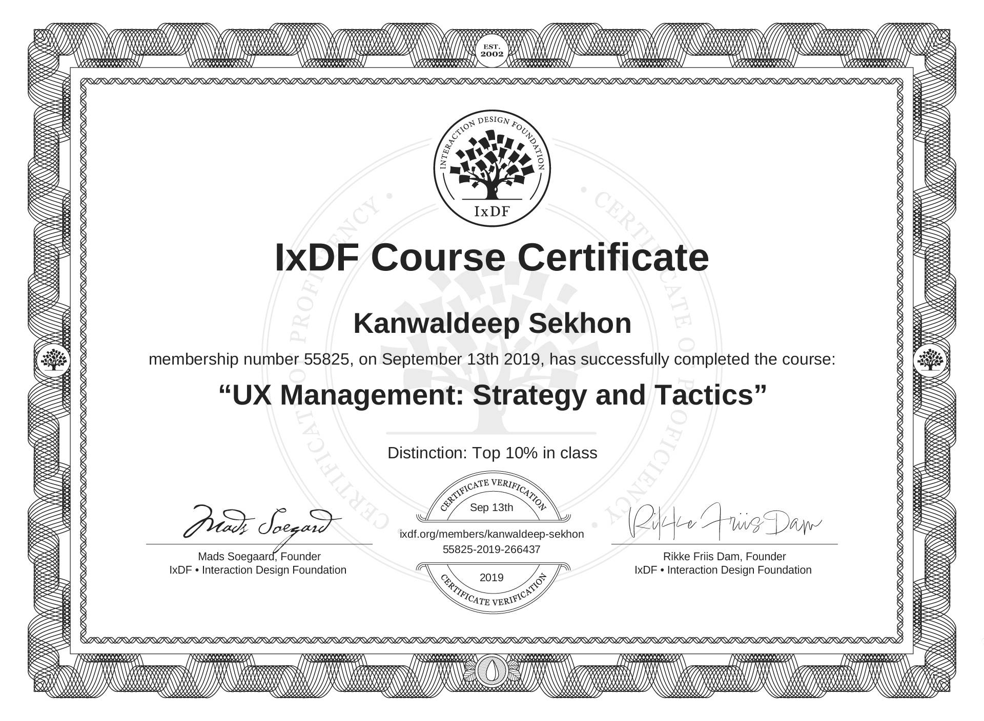 Kanwaldeep Sekhon's IxDF Course Certificate: UX Management: Strategy and Tactics