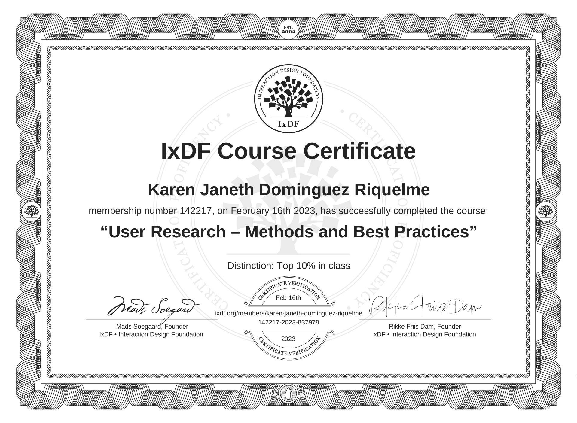 The IxDF Course Certificate above is awarded to Karen Janeth Domínguez Riquelme with a Top 10% Distinction in formal recognition of their coursework surpassing the rigorous benchmarks of exceptional performance established by the IxDF Educational Codex.