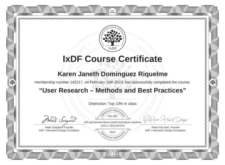 Karen Janeth Domínguez Riquelme's IxDF Course Certificate: User Research – Methods and Best Practices