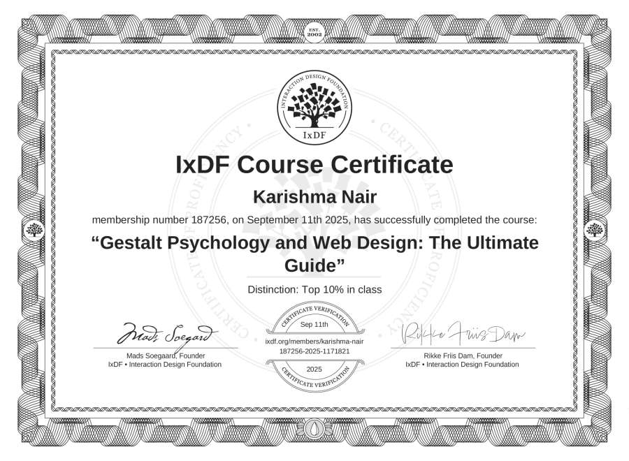 Karishma Nair's IxDF Course Certificate: Gestalt Psychology and Web Design: The Ultimate Guide
