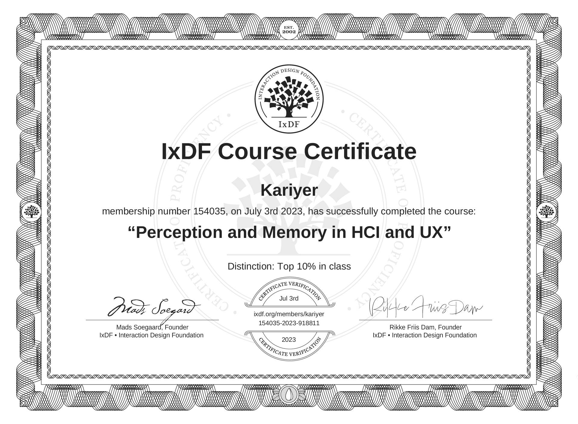 Kariyer's IxDF Course Certificate: Perception and Memory in HCI and UX