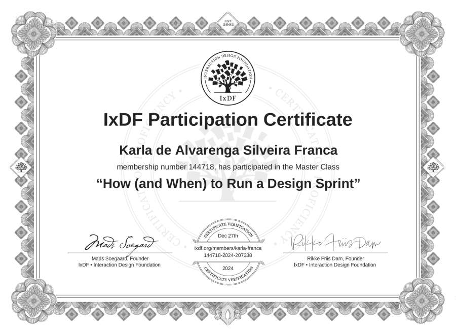 Karla de Alvarenga Silveira França's IxDF Masterclass Certificate: How (and When) to Run a Design Sprint