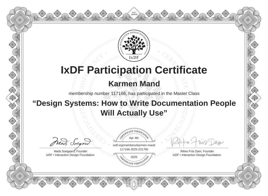 Karmen Mänd's IxDF Masterclass Certificate: Design Systems: How to Write Documentation People Will Actually Use