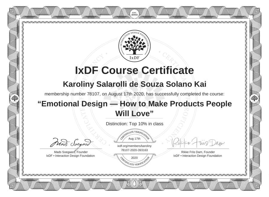 Karoliny Salarolli de Souza Solano Kai's IxDF Course Certificate: Emotional Design — How to Make Products People Will Love