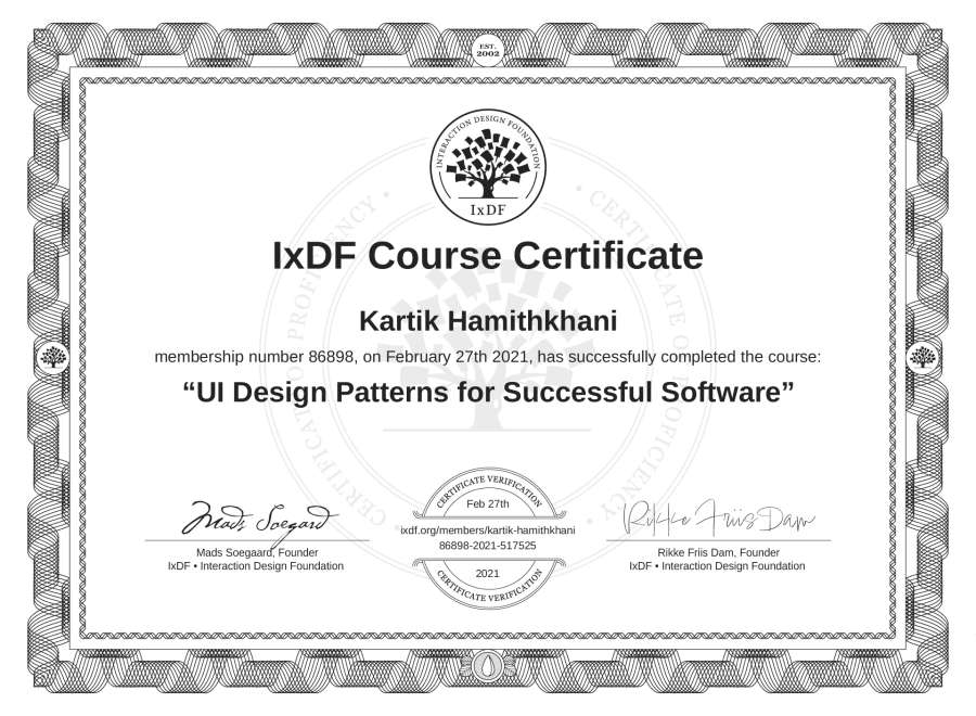 Kartik Hamithkhani's IxDF Course Certificate: UI Design Patterns for Successful Software