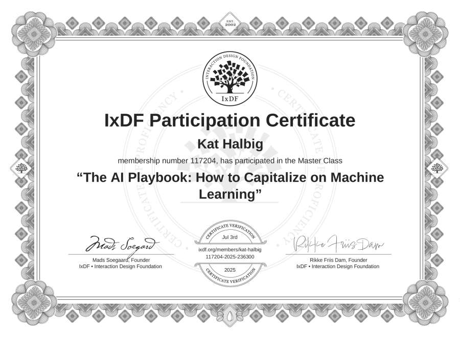 Kat Halbig's IxDF Masterclass Certificate: The AI Playbook: How to Capitalize on Machine Learning